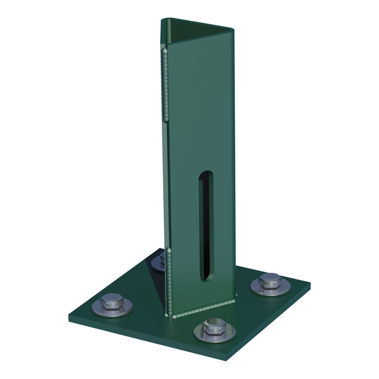 Supporto metallico per palo a “T” 30x30 mm per la posa di reti metalliche su muretto o cordolo in calcestruzzo. Realizzato con acciaio zincato a caldo per immersione e plastificato con poliestere di colore verde. Il supporto è provvisto di fori per il fissaggio al muretto con bulloni ad espansione (non forniti nella scatola). Dimensioni della piastra 100x100 mm. Altezza del supporto 150 mm. Indispensabile per la posa dei pali a T su muretto di cemento, senza bisogno di realizzare fori nel cemento. L'installazione tramite supporti garantisce una posa più rapida, con conseguente riduzione dei costi relativi a manodopera e materiale. Gli spessori elevati della base e l'energica saldatura del profilo assicurano la robustezza necessaria per garantire la tenuta della recinzione. Il supporto è fornito con una vite autoperforante a corredo per il fissaggio del palo al supporto. La zincatura a caldo per immersione garantisce un alto grado di qualità, un'elevata durata nel tempo e la plastificazione in poliestere assicura un'ottima resistenza agli agenti atmosferici ed ai raggi UV