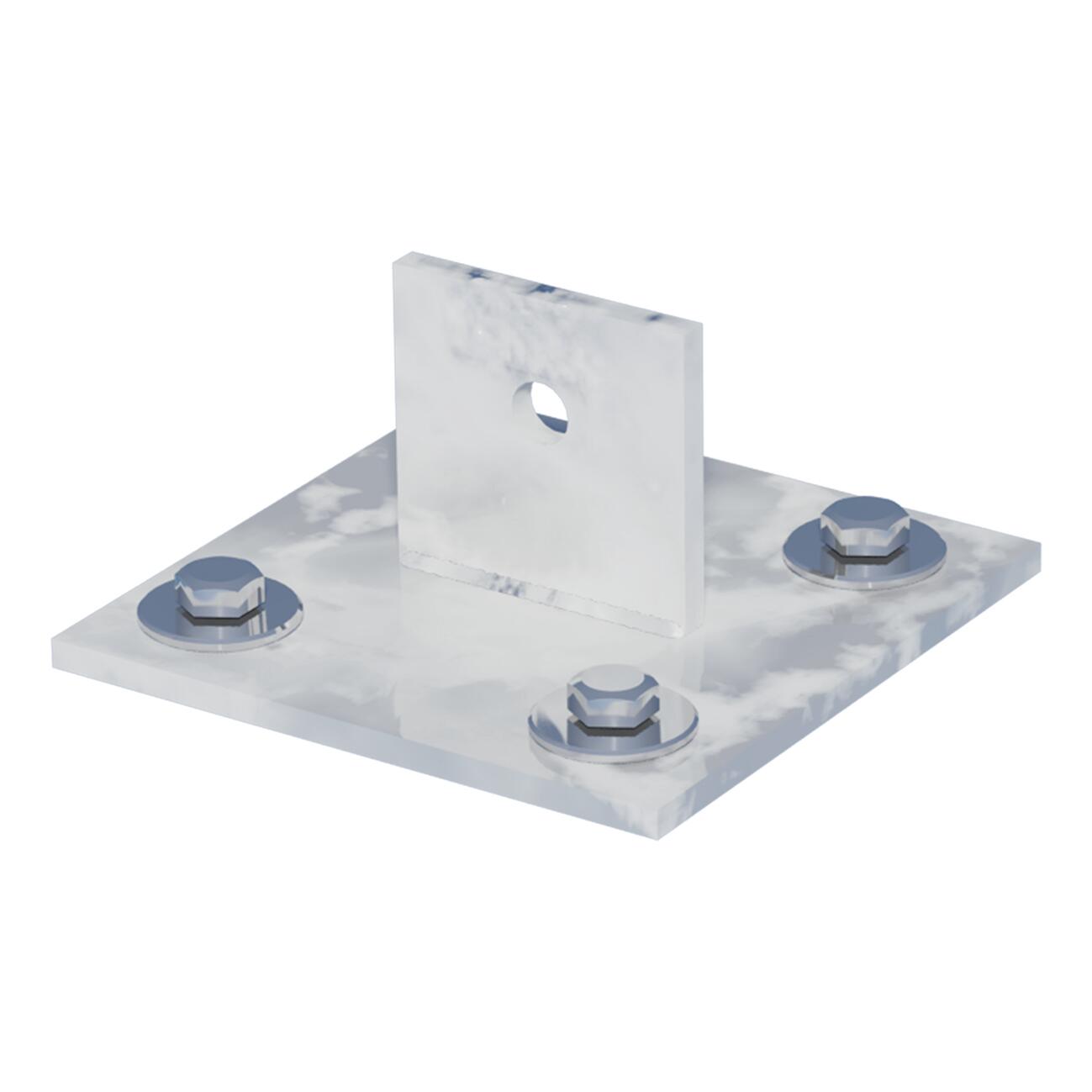 Supporto metallico per saetta angolare per la posa di reti metalliche su muretto o cordolo in calcestruzzo. Realizzato con acciaio zincato a caldo per immersione. Il supporto è provvisto di fori per il fissaggio al muretto con bulloni ad espansione (non forniti nella scatola). Dimensioni della piastra 100x100 mm.. Indispensabile per la posa delle saette su muretto di cemento, senza bisogno di realizzare fori nel cemento. L'installazione tramite supporti garantisce una posa più rapida, con conseguente riduzione dei costi relativi a manodopera e materiale. Gli spessori elevati della base e l'energica saldatura del profilo assicurano la robustezza necessaria per garantire la tenuta della recinzione. Il supporto permette di fissare facilmente la saetta con la corretta angolatura. La zincatura a caldo per immersione garantisce un elevato grado di qualità e durata nel tempo