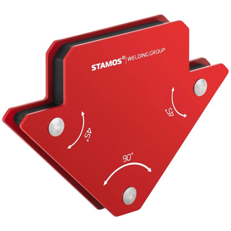 Supporto magnetico per saldatura SWG-MWH-S di Stamos Welding Group Il supporto magnetico per saldatura è stato progetto apposta per l'utilizzo con elementi metallici e permette un collegamento saldo tra i singoli componenti. Grazie alle sue dimensioni pari a 11,5 x 8,3 x 1,4 cm, possono essere posizionati oggetti di grandi dimensioni, ad esempio le piastre d'acciaio. Il robusto supporto magnetico può essere applicato con un angolo di diversi gradi e funge, dunque, come supporto ottimale delle parti di metallo durante la saldatura, brasatura o durante lavori di montaggio professionali. Grazie al design a freccia del supporto magnetico è possibile utilizzarlo in diverse posizioni e quindi in modo multifunzionale. Ogni supporto può essere utilizzato in una posizione di 45, 90 o addirittura 135 gradi. Grazie ai collegamenti magnetici molto forti, i supporti fanno in modo che i più diversi componenti metallici vengano attaccati l'uno all'altro velocemente e in modo accurato. In questo