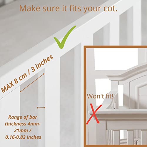 mentre il morsetto è composto da due parti avvitate attorno a una ringhiera per culla fino a 21 mm di larghezza. Il supporto mobile può essere installato su una culla in tre minuti.