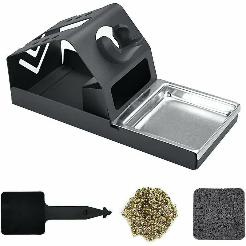 Kit Porta Saldatore Porta saldatore + pulisci punta saldatore + gomma anti-calore + spugna pulizia punta saldatore, facile da usare, facile da pulire e riutilizzabile. Supporto per saldatore: 16 * 6,7 cm / 6,3 x 2,64 pollici, facile da trasportare, non occupa spazio. Ideale per il saldatore. Realizzato con buoni materiali Il supporto per saldatore è realizzato in lega di zinco, resistente e stabile, migliore di quelli di scarsa qualità come ferro e alluminio, più robusto e durevole, resistente alla ruggine e con un certo peso. ha stabilità. Non si muove facilmente. Pulizia bidirezionale del bestiame1. La spugna metallica utilizza materiale in ottone di alta qualità, che è senza fumo, insapore e non tossico, può ridurre efficacemente la ruggine e prolungare la durata della punta del saldatore. È migliore del pad bagnato e inoltre non è necessario versare acqua, non abbassa la temperatura della testa del saldatore ed evita schizzi di saldatura ovunque. 2. Inoltre viene fornito con una