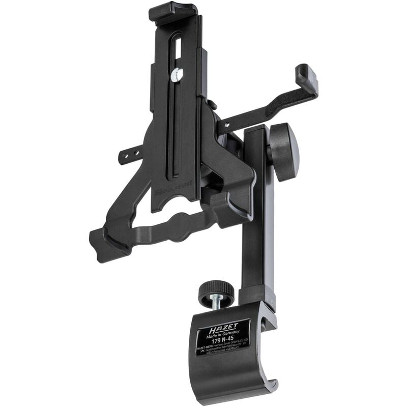 Supporto per tablet Per carrelli portautensili Assistente 177 ∙ 178N ∙ 179N ∙ 179NX ∙ 179NXL ∙ 179NXXL ∙ 179NXXL-8D e banco di lavoro Assistente 177W Il meccanismo di bloccaggio sicuro funziona per tutti i comuni modelli di tablet / PC con dimensioni comprese tra 120 e 222 mm Universale per Apple iPad ∙ mini ∙ Air ∙ Pro, Amazon Kindle ∙ Fire, Samsung Galaxy Tab, Google Nexus, Asus Transformer, Microsoft Surface Possibile anche l'utilizzo di tablet con custodia protettiva o cover La molla di bloccaggio consente di inserire e riprendere velocemente il dispositivo Ampie ganasce con rivestimento integrato in gomma crepla garantiscono una presa sicura senza danneggiare l'apparecchio La staffa angolare regolabile con rivestimento in feltro e cappuccio in gomma permette una maggiore sicurezza quando il supporto per tablet è posizionato in verticale - Si impedisce la caduta dell'apparecchio Ganasce regolabili individualmente - assenza di problemi di funzionamento degli elementi di comando