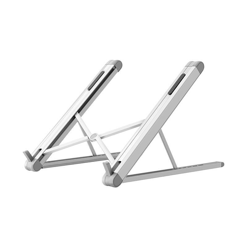 SUPPORTO X PC PIEGH IN ALLUMINIO. Pieghevole 10 x 2 cm in un comodo astuccio (incluso) per il trasporto.. 6 diverse inclinazioni per un miglior angolo di visione ed ergonomia..: Supporto compatibile con PC portatili e Tablet con dimensioni da 9,7 a 15.6 pollici.. Cuscinetti in silicone antiscivolo per una maggiore stabilità e per evitare graffi su tavoli e scrivanie..: Il design garantisce la ventilazione e la dissipazione del calore evitando il surriscaldamento del dispositivo.