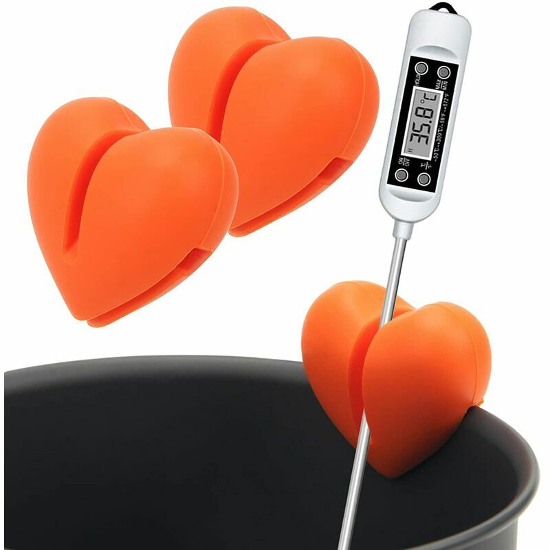 Proteggi le mani - : questo supporto per clip per termometro può aiutarti a fissare il termometro sul bordo della pentola, liberare le mani e impedire che le mani si brucino durante la cottura e può anche impedire che la temperatura si bruci. errore di temperatura causato dal termometro che tocca il fondo o la parete della pentola. [Ben fatto]: il supporto per termometro digitale è realizzato in gel di silice commestibile, che è durevole, sicuro e innocuo per il corpo, e può essere utilizzato in sicurezza. [Resistenza alle alte temperature]: il supporto del termometro può resistere a temperature elevate fino a 446 ° F ed è adatto per cucinare la maggior parte dei cibi. (Non toccare la fiamma aperta e non metterla nel forno) [Ampia applicazione]: il supporto del morsetto del barattolo del termometro può essere attaccato al bordo del barattolo e del becher per aiutarti ad attaccarlo il termometro quando si preparano caramelle, torte, marmellate, cioccolato e cibi fritti e misurare con
