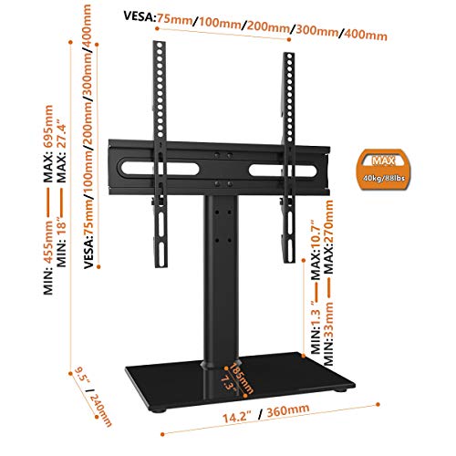 Stabilità e molte applicazioni: supporto universale per TV ☞ Progettato con un pannello ellittico in acciaio resistente e base in vetro temperato da 8 mm, il mio supporto per TV stabile può facilmente tenere la TV sul tavolo con sicurezza e stabilità, oltre al mio supporto universale per TV da tavolo si adatta facilmente a TV da 27 a 55 pollici con motivo VESA da 100 mm x 100 mm a 400 mm x 400 mm x 4000 mm. Può contenere fino a 39, 9 kg