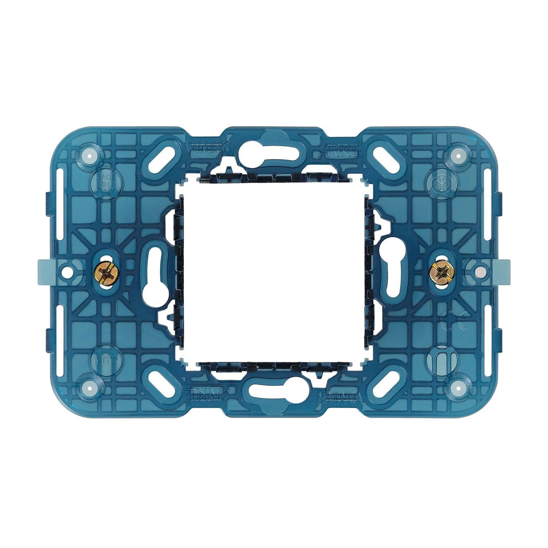 Supporto 2 moduli centrali, con viti, per scatole da incasso 3 moduli e per scatole con interasse 60 mm o 56x56 mm, apparecchi agganciabili in orizzontale o in verticale. Direzione di montaggio orizzontale e verticale. per installazione da incasso con fissaggio a viti. La semitrasparenza facilita installazione e cablaggio degli apparecchi. I denti di aggancio favoriscono il fissaggio in batteria per l'installazione di più moduli. Grazie alle asole centrali è possibile fissare a livello il supporto nella parete