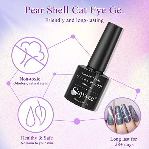 Qualità sana: lo smalto gel Supwee Shell Cat Eye è realizzato in resina naturale, dura più di 28 giorni, è inodore, non tossico, non danneggia la pelle, non danneggia le unghie e il corpo. Si prega di utilizzarlo con fiducia.