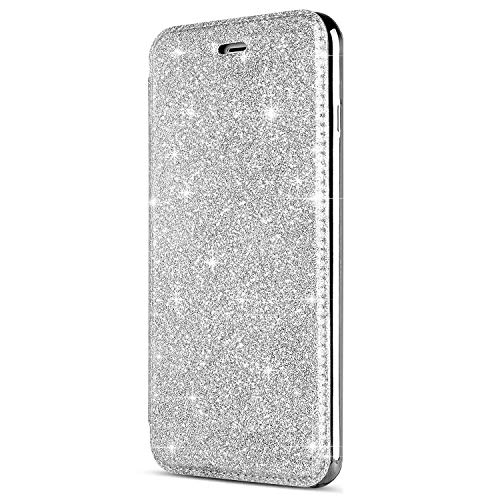 Surakey Cover Compatibile con iPhone 7/8 Glitter Bling Flip Portafoglio Custodia in PU Pelle + Trasparente Silicone Back Case Placcatura Lusso Ultra Sottile Cover a Libro con Tasche per Carte,Argento