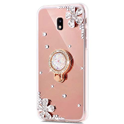 Surakey Cover Compatibile con Samsung Galaxy J7 2017, Effetto Specchio Silicone Cover con Fiore Strass Bling Lusso Rotazione Grip Ring Supporto Case Ultra Sottile Protettiva Custodia,Oro Rosa