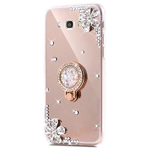 Surakey Cover Compatible con Samsung Galaxy Grand Prime G530, Effetto Specchio Silicone Cover con Fiore Strass Bling Lusso Rotazione Grip Ring Supporto Sottile Protettiva Custodia,Oro