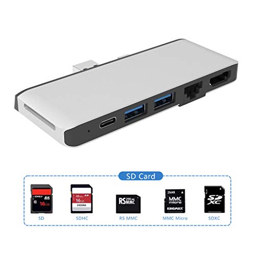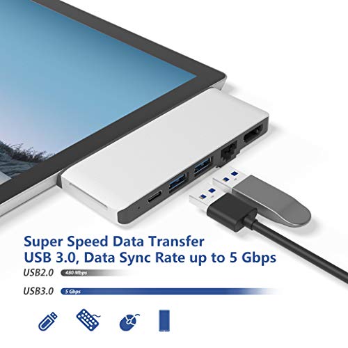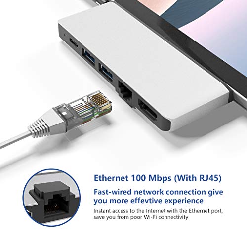 【Design per Surface Pro 7】: l'adattatore per hub Surface Pro 7 è speciale smussato e altamente compatibile per il tuo Microsoft Surface Pro 7 2019 , che trasforma la connessione USB-A e USB C in 6 porte (HDMI 4K / 30Hz, Ethernet 100M LAN , Porta USB-C (trasferimento audio e dati), 2 x USB-A, lettore di schede SD) Nota: questo dock pro Surface non si adatta molto bene alla superficie se si utilizza una custodia protettiva.