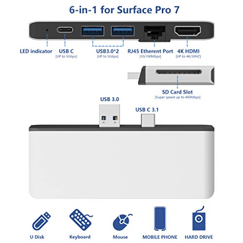 Surface Pro 7 Hub Docking station, adattatore Surface Pro 7 6 in 1 con 4K HDMI, LAN Ethernet 100M, 2 USB 3.0, adattatore combinato convertitore lettore di schede SD per Microsoft Surface Pro 7