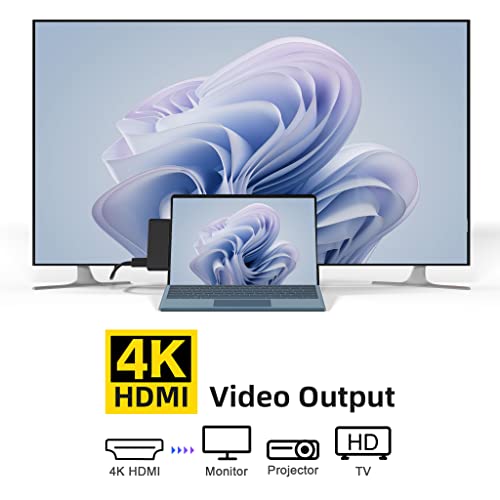 【100W USB-C Power Delivery】 La docking station Surface Pro 9 supporta l'alimentazione USB C 100W pass-through per il vostro Microsoft Surface Pro 9/X. La docking station per Surface Pro 9 supporta la trasmissione dati a 10Gbps, per un trasferimento veloce di file di grandi dimensioni. Supporta anche la funzione di visualizzazione per estendere il Surface Pro 9 a un proiettore monitor HDTV con effetto 4K.
