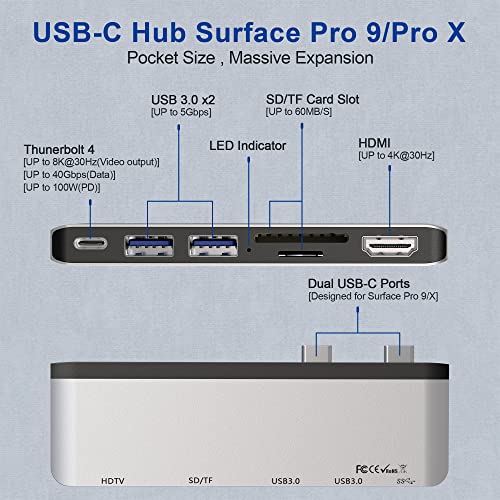 Surface Pro 9 Hub Docking Station con HDMI 4K, USB-C Thunerbolt 4 (video+dati+carica 100W), 2x USB3.0, SD+TF, triplo display (Surface Pro9+HDMI+USB C) per Microsoft Surface Pro 9/Pro X