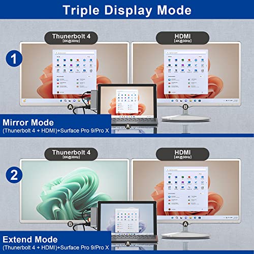 【Flessibilità del display video triplo Surface Pro 9 docking station】 Display video triplo (Ultra HD 4K HDMI + USB-C Thunerbolt 4) + modalità Surface Pro 9 Aumenta la tua efficienza di 3 volte. Questo adattatore hub per Surface Pro 9 consente di estendere 2 monitor che forniscono più spazio per il lavoro e si può fare progetti diversi su monitor diversi. Supporta la modalità Extend o Mirror, risoluzione HDMI fino a 4K@30Hz, risoluzione USB-C Thunerbolt 4 fino a 8K@30Hz.