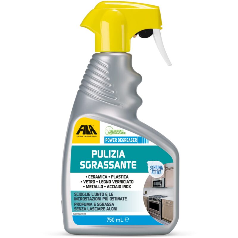 Descrizione Descrizione POWER DEGREASER di FILA Surface Care Solutions. Sgrassatore spray a schiuma attiva. Ideale per: ceramica, plastica, vetro, legno verniciato, metallo e acciaio inossidabile. FORMATO e RESA Spray da 750ml. VANTAGGI - Schiuma attiva: non cola sulle superfici. - Preciso nello spruzzo. - Adatto alle superfici più delicate. - Rapido: agisce in pochi secondi. - Efficace contro le incrostazioni più ostinate. - Adatto all'utilizzo in garage: moto, auto, bicilette, utensili, etc. - Pulisci il forno e il barbecue efficacemente. - Profumazione alla menta e lime. - Componenti biodegradabili: non contiene solventi. COME SI USA 1. Spruzza POWER DEGREASER sulla superficie da pulire. 2. Lasciare agire qualche secondo. 3. Passare una spugna o un panno umido sulla superficie. In caso di sporco leggero si può spruzzare su una spugna umida e passare questa sulla superficie da pulire. AVVERTENZE - Tenere fuori dalla portata dei bambini. - Non disperdere nell'ambiente dopo l'uso.