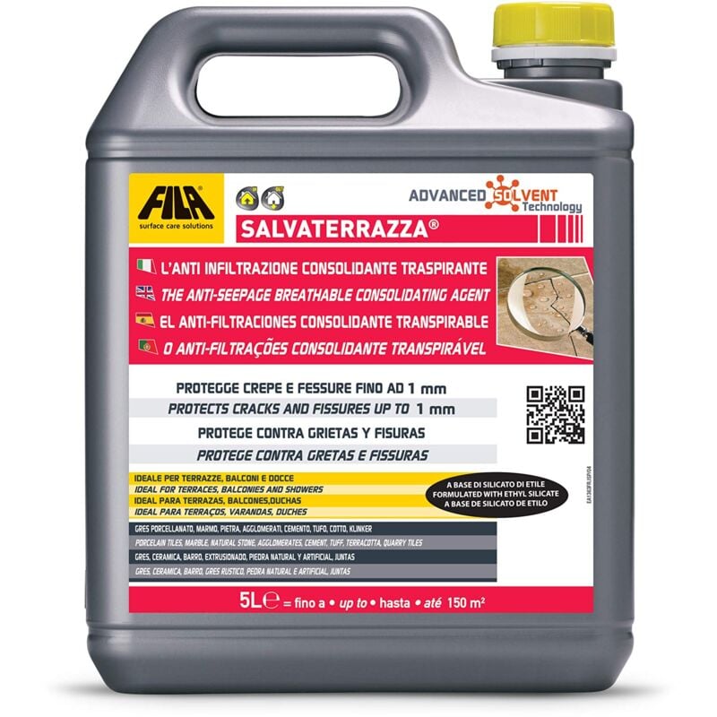SALVATERRAZZA è un protettivo idrorepellente che consolida e protegge materiali come cotto, clinker, gres, cemento, pietra naturale, agglomerati, prevenendo e bloccando il problema delle infiltrazioni. Avendo una funzione impermeabilizzante può essere usato su terrazzi, superfici esterne, interne ed in interni doccia nella quale sono presenti infiltrazioni, permette di ridurre le infiltrazioni creando, contemporaneamente, un effetto idrorepellente anti infiltrazione. SALVATERRAZZA di FILA consolida il materiale su cui viene applicato senza modificarne il colore e senza creare un film, penetra in profondità nei diversi materiali che compongono terrazze, superfici esterne ed interne creando una barriera traspirante che limita l'assorbimento dell'acqua. Il suo impiego è importante, perché le lesioni e le fessure sulla pavimentazione delle terrazze permettono di far penetrare l'acqua, la quale genera inconvenienti come: muffe, efflorescenze, risalita di sali e inquinanti, colature d'acqua