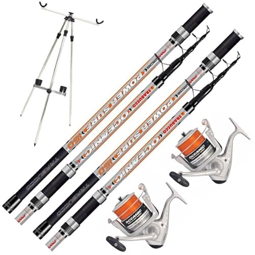 Kit Surfcasting Completo 2 Canne Telescopiche Oceanic 150g 4m + 2 Mulinelli Surfcasting + Tripode Surf 180cm (Mulinelli Trabucco Sonic 8000)