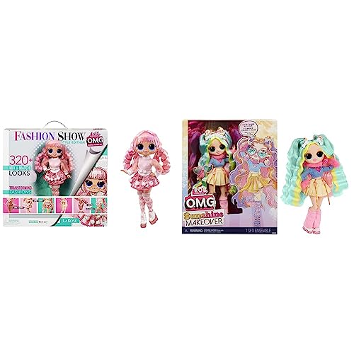 Prodotto 1: TANTISSIME SORPRESE. Include una fashion doll OMG Sunshine Makeover, un outfit audace, scarpe, scaldamuscoli, accessori, occhiali a forma di cuore, orecchini a forma di emoji, una spazzola e un supporto per bambole