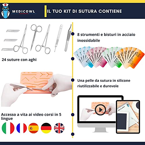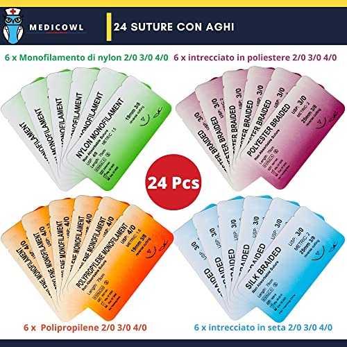 Con un totale di 33 pezzi, Medicowl ti offre il kit di sutura più completo e più fornito sul mercato. Si compone di: Pinza Adson con denti / Impugnatura per bisturi / Forbice Iris / Porta aghi / Pinza emostatica / Simulatore di sutura in silicone / 3 lame per bisturi / 24 fili di sutura in nylon e seta intrecciata. Il tutto è raccolto in una custodia di qualità che permette una perfetta organizzazione degli strumenti e ne facilita il trasporto.