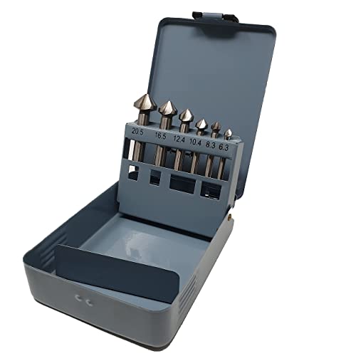 Set di 6 svasatori conici HSS-G, 6,3/8,3/10,4/12,4/16,5 e 20,5 mm, 90° Z3, in pratica scatola di metallo