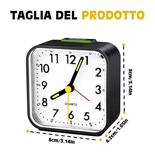 Sveglia Analogica Silenziosa senza Ticchettio, Sveglie da Comodino con Funzione Snooze e Luce, Portatile Sveglia al Quarzo Alimentata a Batteria per Camera da Letto, Soggiorno, Ufficio, Viaggi