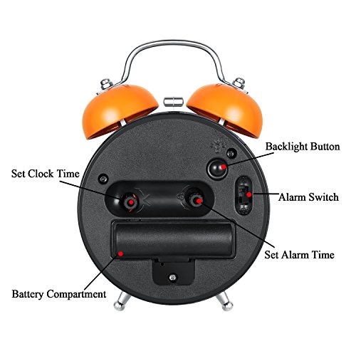 Sveglia da comodino stile vintage, analogica, al quarzo, a doppia campana,3 pollici Grande Quadrante funzione sveglia con allarme sonoro forte, senza ticchettio, luce notturna (Arancione)