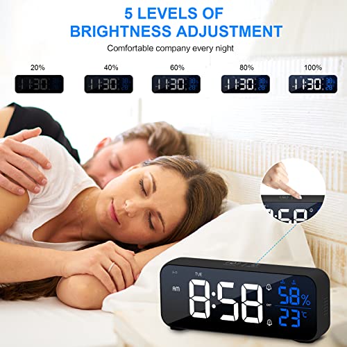 Sveglia Digitale, Grande Orologio Digitale a LED, Orologio da Tavolo da Parete con Indicatore di Temperatura e Umidità, Doppia Sveglia, 5 livelli di luminosità, Porta di Ricarica USB, 12/24 HR (Nero)