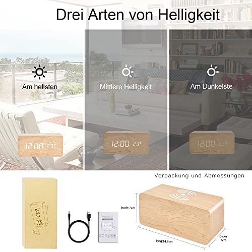 Sveglia digitale multifunzionale: la modalità di controllo vocale e le 2 modalità di visualizzazione mostrano l'ora (12/24 ore)/data/mese/anno/temperatura (°C/°F)/umidità dell'aria. Questa sveglia in legno con 3 livelli di luminosità regolabili si accende quando il suono supera i 60 decibel o quando viene digitato.