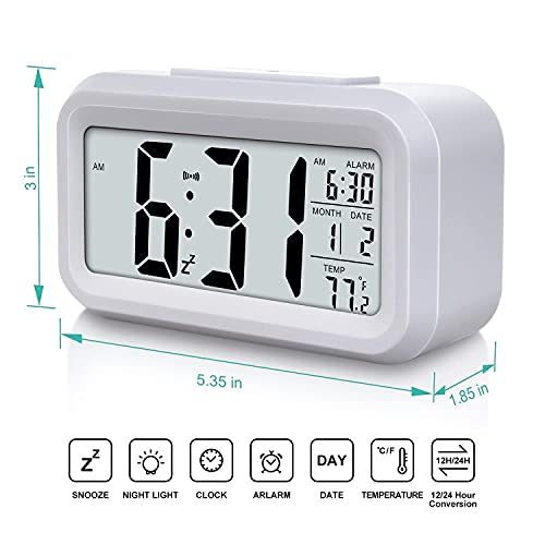 Sveglia retroilluminata perfetta: con grandi numeri LCD bianchi, facile da leggere giorno o notte. Con 12/24 ore commutabile, sveglia, funzione snooze e visualizzazione della temperatura. Questa semplice sveglia con pulsante di impostazione intuitivo, facile da impostare l'ora o la sveglia. Facile per bambini, anziani e anziani.