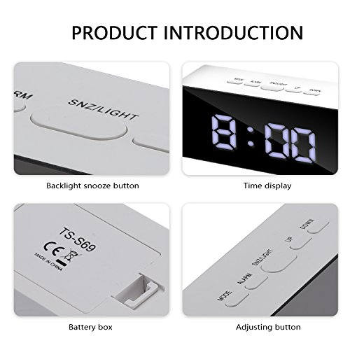 Multi-funzione: sveglia con display a LED alla moda, è possibile impostare 2 livelli di luminosità del display a LED e si può vedere chiaramente l'orario di notte. Include impostazione di allarme e temperatura interna. È anche possibile utilizzare la sveglia come uno specchio.