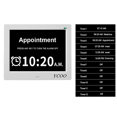 Sveglia con orologio digitale, formato extra large, con data e mese non abbreviati, schermo da 8 pollici, 12 opzioni di sveglia, perfetta per chi ha problemi di vista, perfetta per casa e ufficio, plastica, White, Bianco