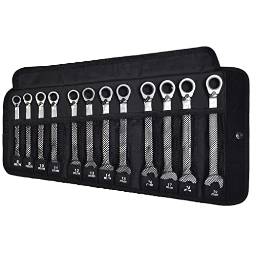 Il set di chiavi combinate a cricchetto con funzione a cricchetto offre 12 diverse dimensioni di chiavi con inserto a cricchetto dentato fine sul lato della chiave ad anello.