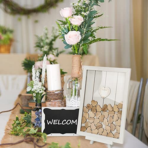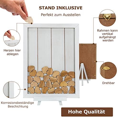 Libro degli ospiti per matrimonio: set composto da 80 piccoli cuori in legno, 1 grande cuore, cornice per foto, lavagna e supporto, scatola abbinata