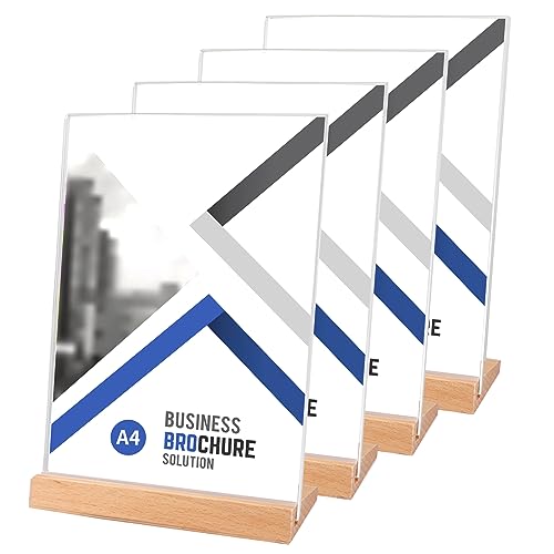SWAWIS 4 Pezzi Porta Menu da Tavolo Espositore A4 in Acrilico Supporti Menù con Base in Legno Espositori Plexiglass Trasparente Porta Poster e Porta Menu per Bar, Ristoranti e Hotel