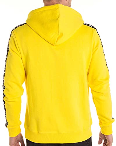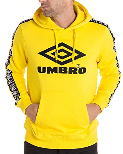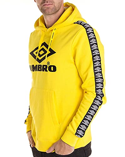 Sweat de la marque UMBRO de couleur jaune. A capuche munie de cordon de serrage imprimé UMBRO en noir. Logo sur tout le torse. Bandes sur chaque longueur des manches imprimées de la marque. Poches kangourou. Intérieur polaire. Composition: 75% coton 25% polyester. Notre mannequin mesure 1m87, tour de poitrine 109 cm et porte la taille L.