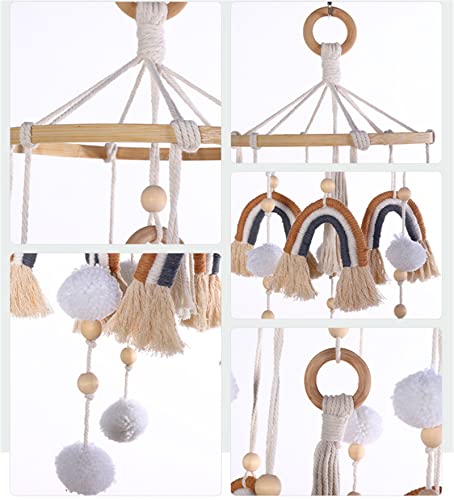 SWECOMZE Lettino arcobaleno in legno con pompon, per cameretta dei bambini, campanella a vento, scacciapensieri da appendere, per lettino dei bambini (grigio)