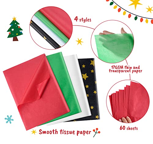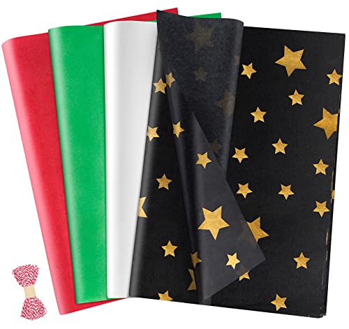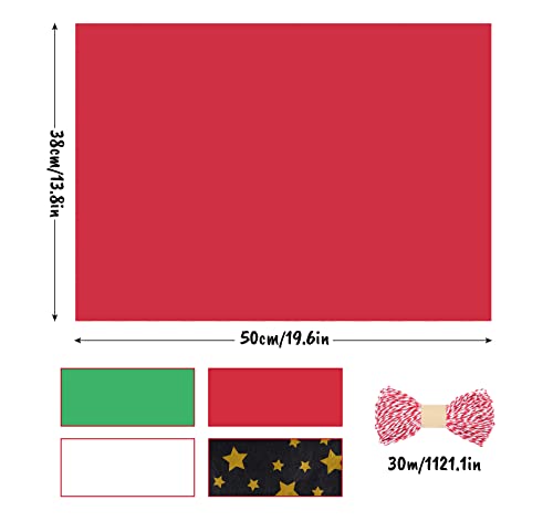 Sweelov 60 fogli di carta velina natalizia colorata in 4 colori, per fai da te, colore rosso, bianco, verde, stella nera, per confezionare il fai da te, con 30 m di filo, 50 x 35 cm