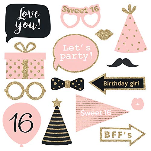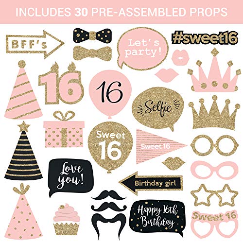 Sweet 16 accessori per cabina fotografica, completamente assemblati, non fai da te, 30 pezzi, per 16° compleanno, colore: rosa, oro e nero, con brillantini veri