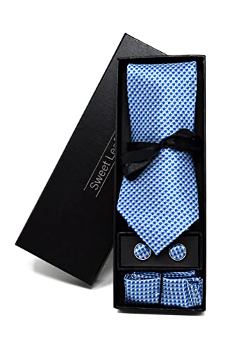 Sweet Leaf Cravatta da uomo, Fazzoletto da Taschino e Gemelli Azzurro a Righe - 100% seta - Classico, Elegante e Moderno - (Confezione Regalo, ideale per un matrimonio, con un abito, in ufficio.)