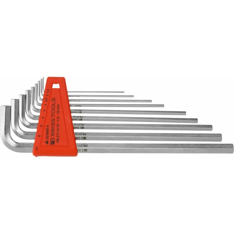 Gambo piegato a gomito secondo DIN ISO 2936 L, estremità lavorate in piano e smussate. Acciaio al cromo-vanadio, temprato (tenace). Lega speciale PB Swiss Tools, superficie nichelata e cromata. Contenuto: Cad. 1 chiave maschio piegata n. art. 626090: Dim. 1,5;