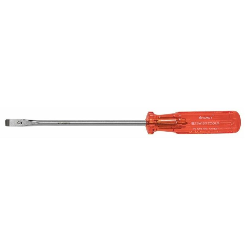 Lame forgiate, le punte si adattano perfettamente alle impronte normalizzate delle viti. Impugnatura robusta “Classic” in plastica trasparente e resistente agli urti (senza cadmio). Lama in lega speciale PB Swiss Tools particolarmente tenace e dall'elevata durezza. Con tagliente pianparallelo ribassato. Superficie nichelata e cromata, tagliente brunito. Norma: Ähnlich DIN 5265 Form A. Nota: La massima durata dei girativi a norma è garantita se i giraviti vengono utilizzati su viti con intaglio secondo normativa, e quindi con corrispondenza esatta (vedi tabella). Dati tecnici Tipo di prodotto Giravite Serie Classic Lunghezza complessiva, mm 270 Lunghezza lama, mm 160 Larghezza delle punte b, mm 8 Codice lama 5 Spessore delle punte a, mm 1,2