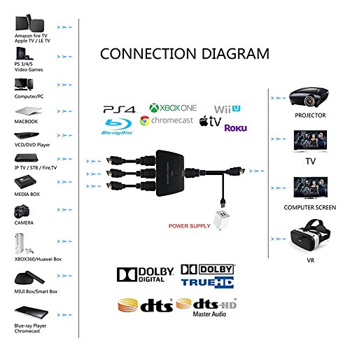 Facile da installare e non è necessario alcun adattatore di alimentazione esterno se vengono utilizzate tutte le porte, il che in questi casi garantisce un risparmio energetico. L'interruttore seleziona automaticamente l'ultima sorgente di segnale quando tutti e 3 i dispositivi sono collegati, è anche possibile selezionare la sorgente desiderata premendo manualmente il pulsante.