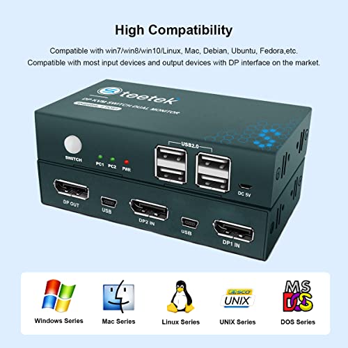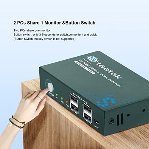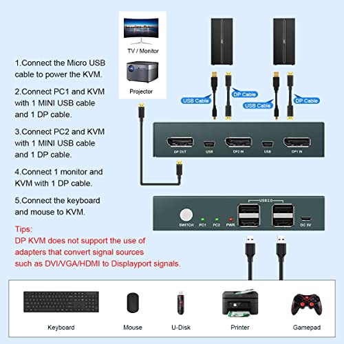 【KVM Switch Displayport 2 In 1 Out】KVM Switch Displayport 2 porte possono passare liberamente tra due set di sorgenti audio e video HD, solo 1 set di tastiera e mouse controlla 2 PC e condivide 1 monitor. Che supportano l'uso di tastiere cablate/wireless/meccaniche. Tieni presente che questo KVM non supporta la conversione di sorgenti di segnale come DVI/VGA/HDMI in Displayport. Le docking station e gli adattatori non sono supportati sulle porte di ingresso.
