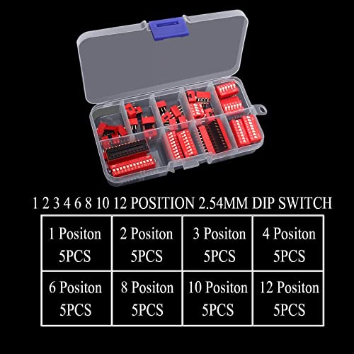 Come con dip switch da 40mm a 2,54mm, 1 2 3 4 6 8 10 12 Position 5pcs di ciascuna posizione. Anche con una scatola di plastica per conservarli, mantiene questi interruttori a levetta ben organizzati.