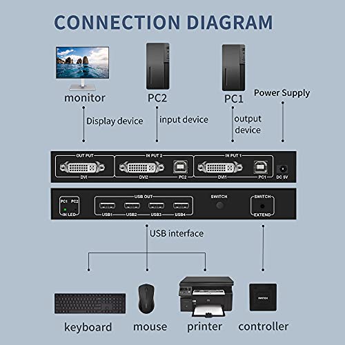 【2 modalità di commutazione】Può essere commutato tramite cavo di prolunga o pulsante host, che è comodo e veloce. Nota: questo switch KVM senza tasto di scelta rapida. Il DVI Switcher Box supporta anche giochi online e DVR. Plug and Play: nessun alimentatore o software necessario. Uscita dello schermo audio di sincronizzazione audio video allo stesso tempo, goditi il mondo del suono.