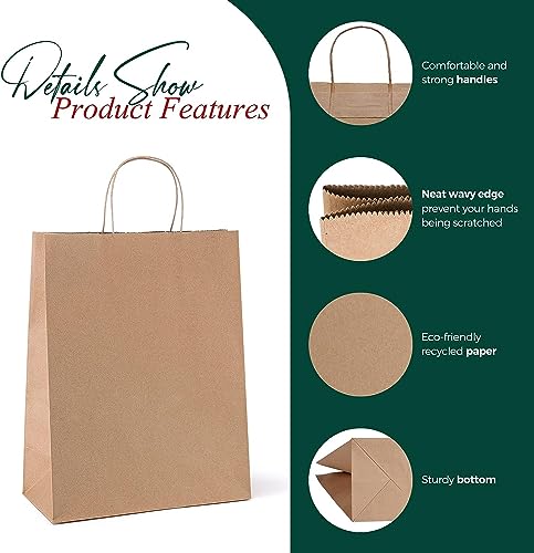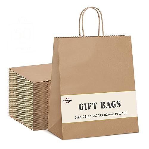 Switory Sacchetto regalo in carta kraft marrone con manici, 20,5 x 12,7 x 33 cm, sacchetti di carta per la spesa, 100 pezzi, bomboniere, vendita al dettaglio, piccole imprese, imballaggio, Natale