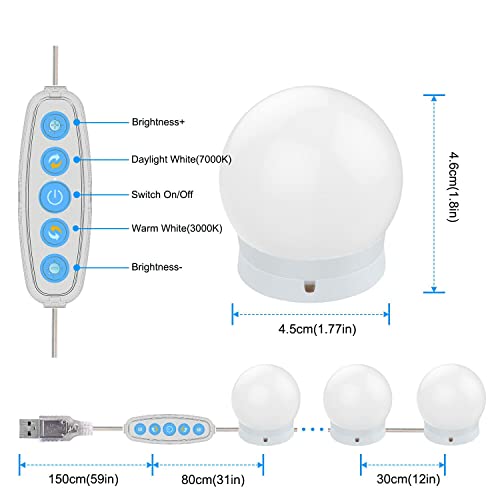 Funzione di memoria e luminosità regolabili a 5 livelli: questo kit di luci a specchio in stile hollywood offre una luminosità di 5 livelli. Ti permetterà di completare il trucco perfetto e la medicazione. È possibile selezionare la luminosità desiderata premendo il pulsante "+" e "-". La funzione di memoria intuitiva consente alle luci di rimanere sempre al livello di luminosità desiderato quando l'ultima volta è stata spenta.