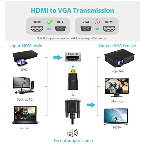 Ultra Piccolo e Design Compatto: Installazione rapida e semplice. Si collega a Computer, Desktop, Computer Portatile, o altri dispositivi con porta HDMI a un Monitor, Proiettore, HDTV, o altri dispositivi con porta VGA. È necessario un cavo VGA (venduto separatamente).