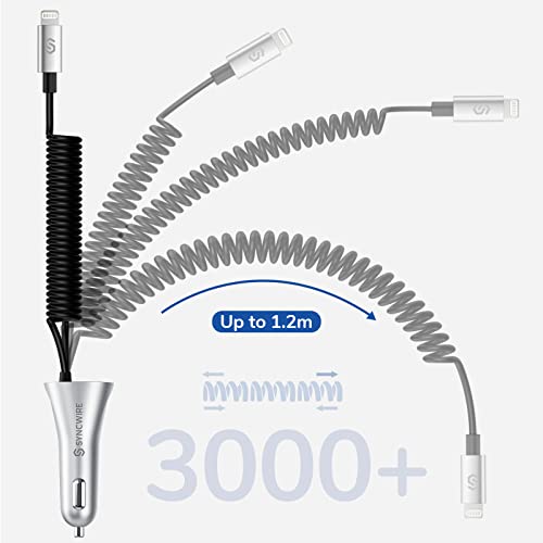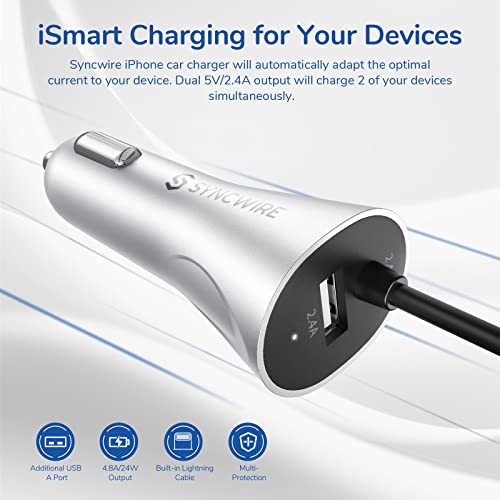 Syncwire Caricabatteria per Auto 4.8A/24W - Ricarica Rapida con Cavo Lightning MFi C89 e Porta USB per iPhone 13/13 Pro/12/12 Pro/11/XR/XS/X/8/7/6s, iPad, Galaxy, Pixel, Xiaomi e Altro - Argento